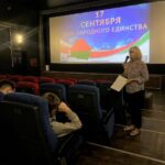 14 сентября в кинотеатре «Космос» библиотека презентовала выставку-просмотр «Единством Беларусь сильна!», приуроченную к празднованию Дня народного единства и демонстрации премьеры фильма «На другом берегу».