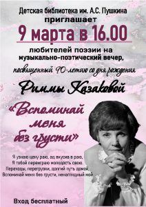 9 марта в 16.00 библиотека приглашает на музыкально-поэтический вечер, посвященный судьбе и творчеству замечательной РИММЫ КАЗАКОВОЙ.