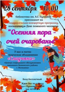 28 сентября библиотека приглашает на поздравительно-концертную программу «Осенняя пора – очей очарованье». В программе: поздравления, музыкальные тесты и викторины.