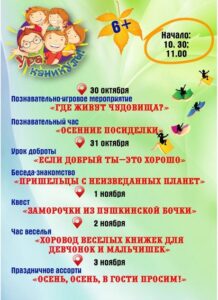 Автор БиблиотекаОпубликовано 30.10.202305.11.2023 Друзья! Вот и наступили долгожданные каникулы! С 30 октября по 5 ноября мы ждем вас в библиотеке на познавательных и игровых мероприятиях! Присоединяйтесь сами и приводите друзей! Вместе веселей! Наш адрес: пр. Пушкинский, 36 Views: 0