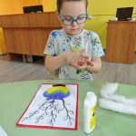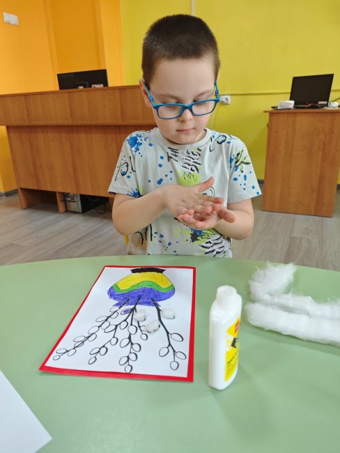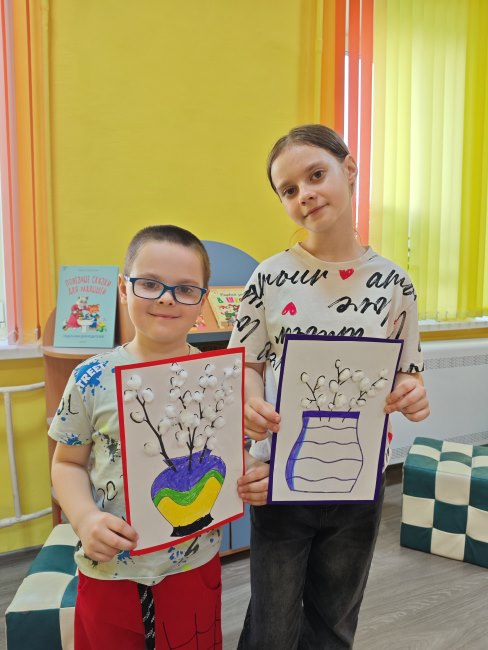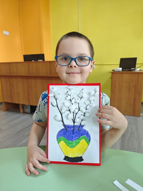 Самый интересный и кропотливый этап поделки — создание пушистых почек на веточках вербы. Ребята скатывали маленькие кусочки ваты и аккуратно приклеивали их к нарисованным веточкам.