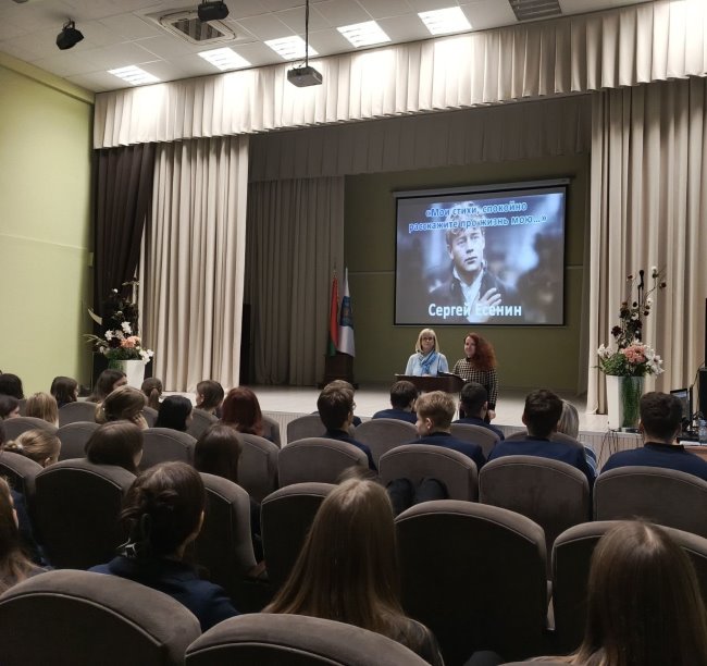 28 октября, в рамках празднования 130 годовщины со дня рождения Сергея Есенина, сотрудники библиотеки совместно с Могилевским областным общественным объединением «Русский Дом» провели литературную гостиную «Мои стихи, спокойно расскажите про жизнь мою…» в ГУО «Средняя школа № 46 г. Могилева» для учащихся 10-11 классов.