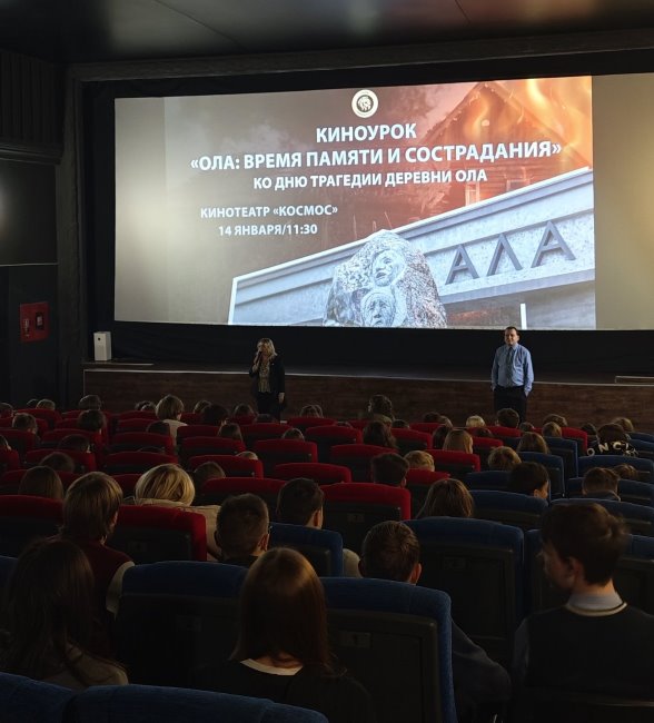14 января, в день памяти сожжения деревни Ола, для учащихся 7-9 классов средних школ Октябрьского района в кинотеатре «Космос» был организован специальный киноурок «Ола: время памяти и сострадания». Ключевым элементом урока стала презентация тематической выставки-просмотра «Беларусь помнит: во имя жизни и мира», подготовленная сотрудниками библиотеки.