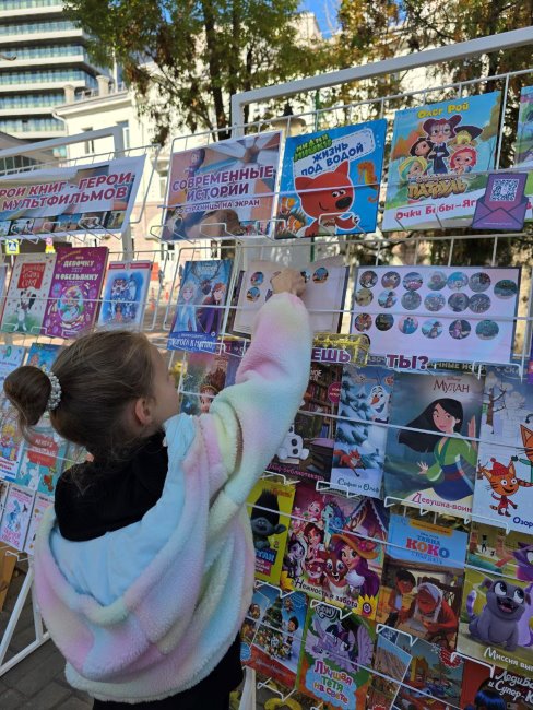 Книжная выставка «Герои книг — герои мультфильмов» предлагала детям и взрослым не только познакомиться с книгами, ставшими знаменитыми мультфильмами, но и поучаствовать в интерактиве: с помощью стикеров проголосовать, кто же круче — книжный персонаж или мультяшный.
